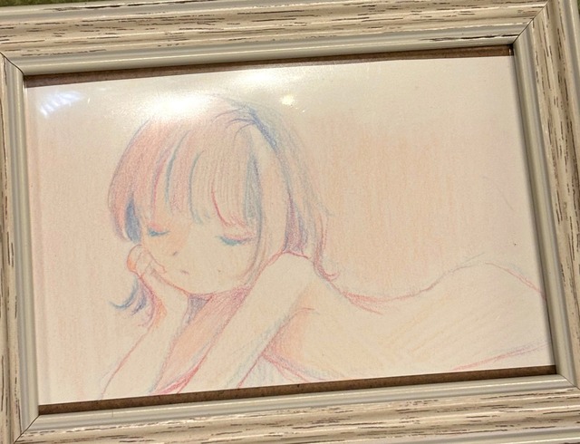 サイズ:8.9cmx12.7cm(額込み) 画材:色鉛筆・画用紙・インク 裏にサイン有り 仮額付き