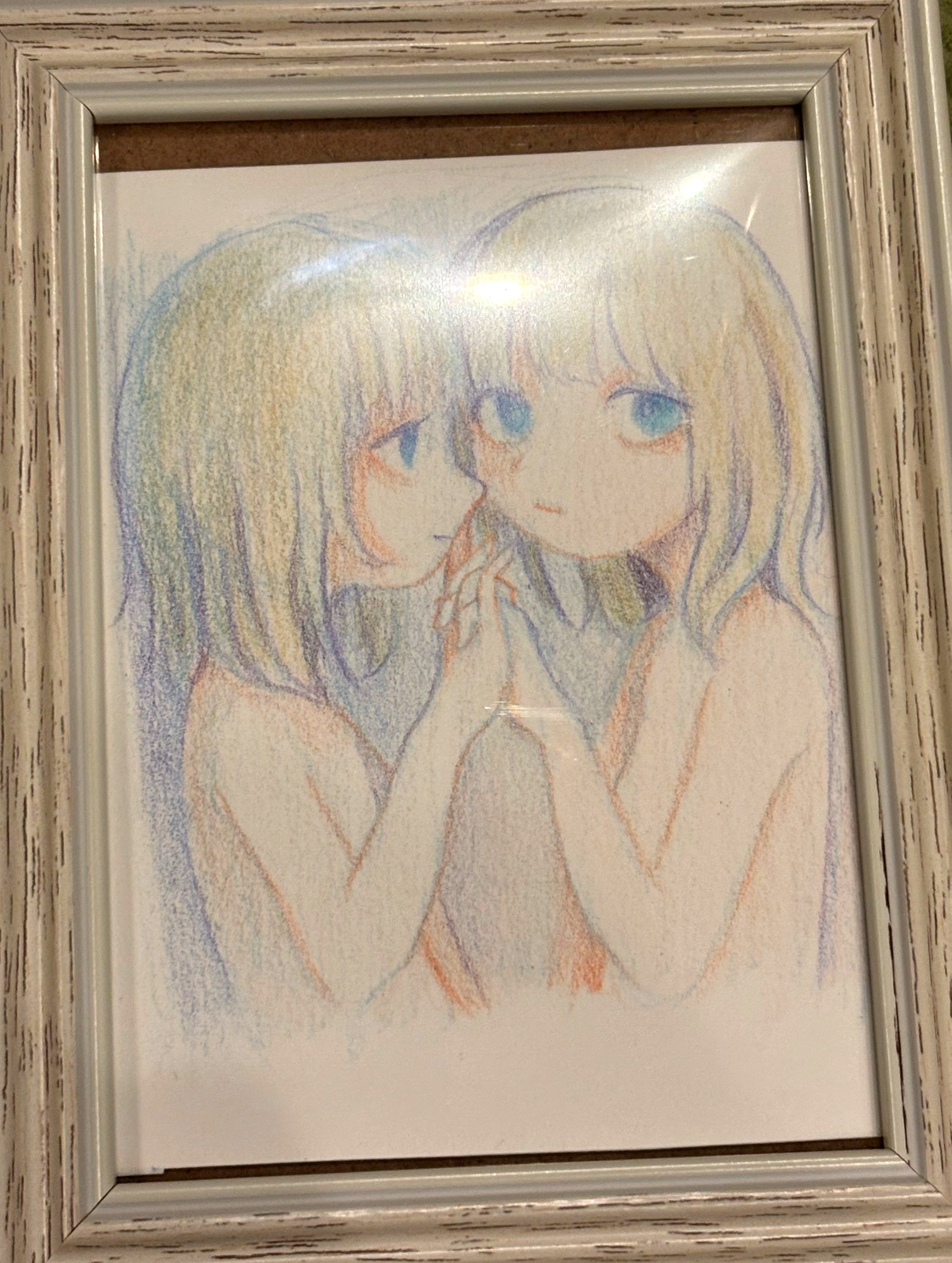 サイズ:8.9cmx12.7cm(額込み) 画材:色鉛筆・画用紙・インク 裏にサイン有り 仮額付き