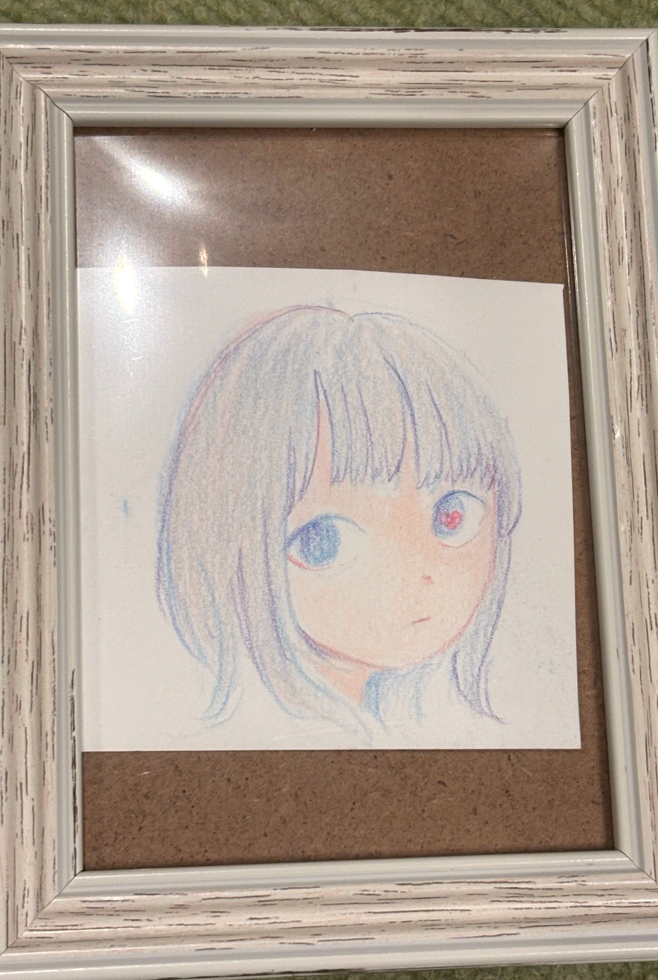サイズ:8.9cmx12.7cm(額込み) 画材:色鉛筆・画用紙・インク 裏にサイン有り 仮額付き